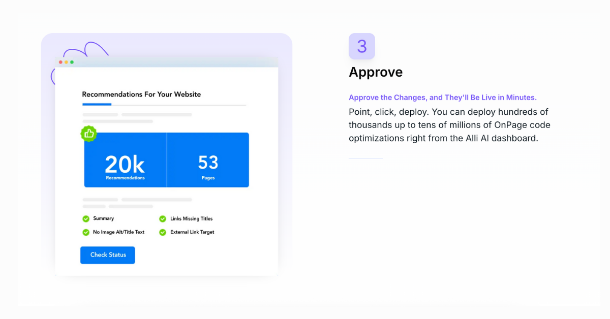 Alli AI revolutionizes SEO by giving teams unprecedented speed and control over on-page optimization. It’s the tool that automates the tedious so you can focus on strategy and growth.