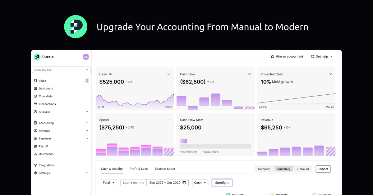 Puzzle.io is an AI-driven accounting platform that delivers real-time dashboards, dual-method accounting, and automation designed for startup founders who want clarity without complexity.