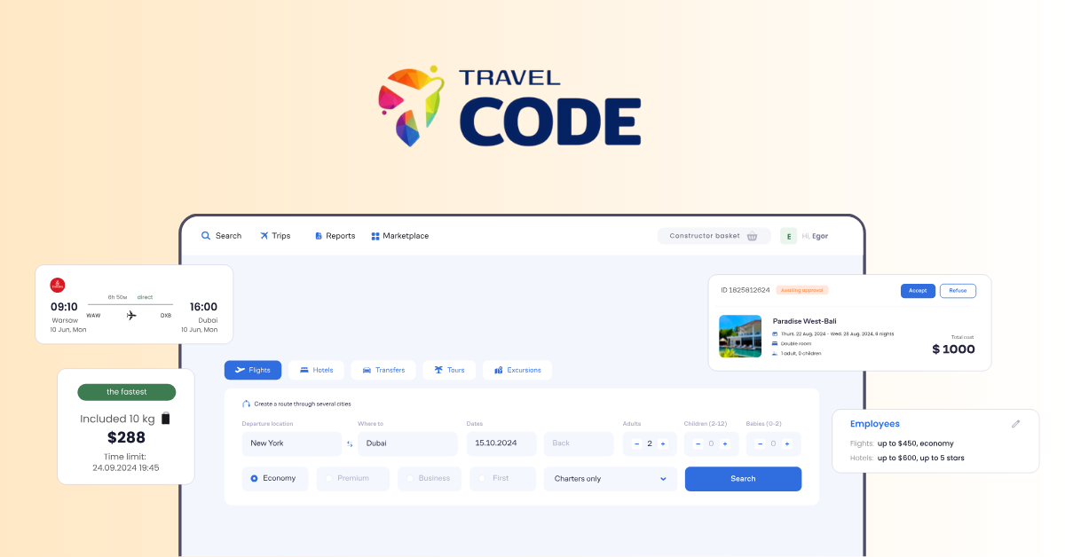 Streamline your corporate travel management with Travel Code, the all-in-one platform that centralizes booking, cost control, itineraries, and policies into one intuitive interface. With powerful features like access to 350 airlines, 2 million hotels, and real-time analytics, Travel Code ensures seamless, efficient travel planning from start to finish.