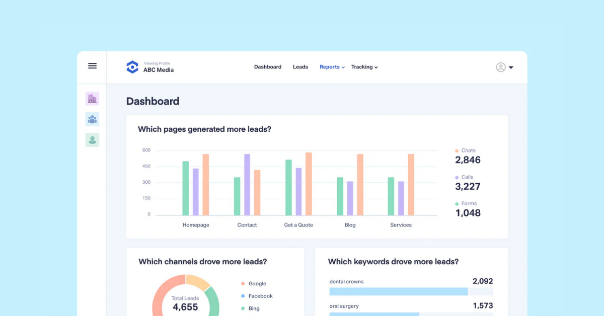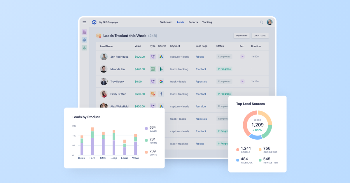 It tracks leads from calls, forms, chat, and e-commerce — attributing each lead to its marketing source.