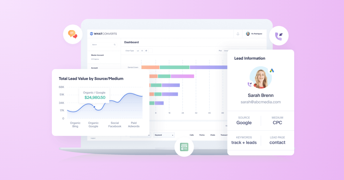 WhatConverts is an all-in-one lead tracking and reporting platform that ties calls, web forms, chats, and ecommerce transactions back to your marketing campaigns — delivering a clear picture of what works.